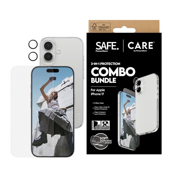 Das CARE by PanzerGlass® Fashion 3-in-1-Set für die iPhone 17-Serie ist perfekt für alle, die Sicherheit mit einem stylischen Telefon kombinieren möchten. Das Set enthält Ultra-Wide Fit- Glas aus 60 % recycelten Materialien , das den Bildschirm effektiv vor Kratzern und Stößen schützt, ohne die Klarheit oder Berührungsempfindlichkeit zu beeinträchtigen. Der ultrabreite Schnitt bietet eine umfassende Displayabdeckung und bietet umfassenden Schutz für Ihr Smartphone.