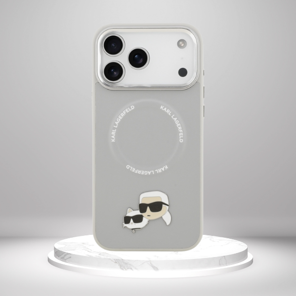 Plecki zdobi charakterystyczny metalowy pin z podobiznami Karla Lagerfelda i jego kotki Choupette, nadający akcesorium unikalnego, modowego charakteru. Całość dopełniają aluminiowa ramka aparatu oraz przyciski boczne w srebrnym kolorze, podkreślające luksusowy charakter produktu. Na pierścieniu MagSafe znajduje się napis „KARL LAGERFELD”, który dodaje elegancji i wyjątkowego stylu.