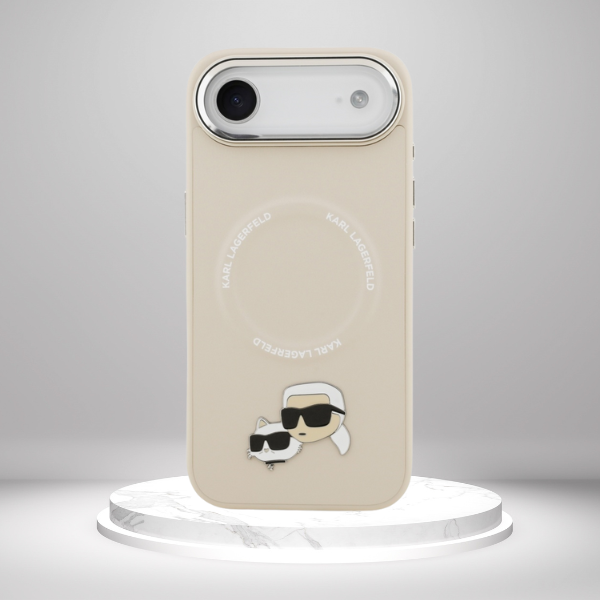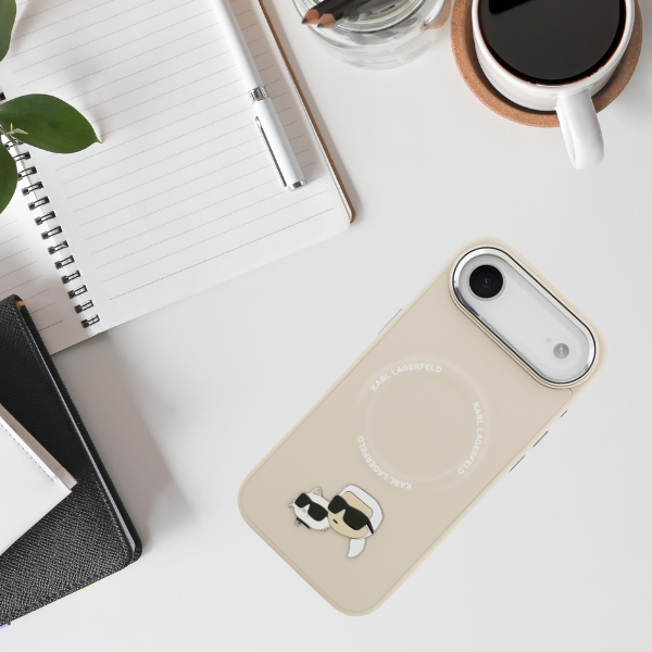 Plecki zdobi charakterystyczny metalowy pin z podobiznami Karla Lagerfelda i jego kotki Choupette, nadający akcesorium unikalnego, modowego charakteru. Całość dopełniają aluminiowa ramka aparatu oraz przyciski boczne w srebrnym kolorze, podkreślające luksusowy charakter produktu. Na pierścieniu MagSafe znajduje się napis „KARL LAGERFELD”, który dodaje elegancji i wyjątkowego stylu.