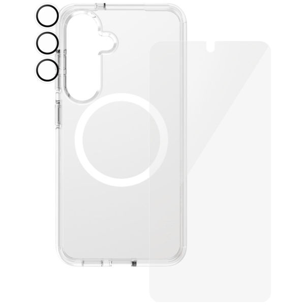 W skład zestawu wchodzi szkło ochronne PanzerGlass® Ultra-Wide Fit, wykonane w 60% z materiałów pochodzących z recyklingu, które pokrywa ekran od krawędzi do krawędzi, chroniąc go przed zarysowaniami i pęknięciami. Osłona obiektywu PanzerGlass® Transparent Hoops® zabezpiecza aparat, nie wpływając na jakość zdjęć, a etui CARE by PanzerGlass® Urban Combat Transparent Case zapewnia niezrównaną ochronę przed upadkami z wysokości do 4,8 metra, jednocześnie eksponując naturalne piękno telefonu. Etui zostało wykonane w 100% z materiałów z recyklingu i jest w pełni kompatybilne z ładowaniem bezprzewodowym Qi.